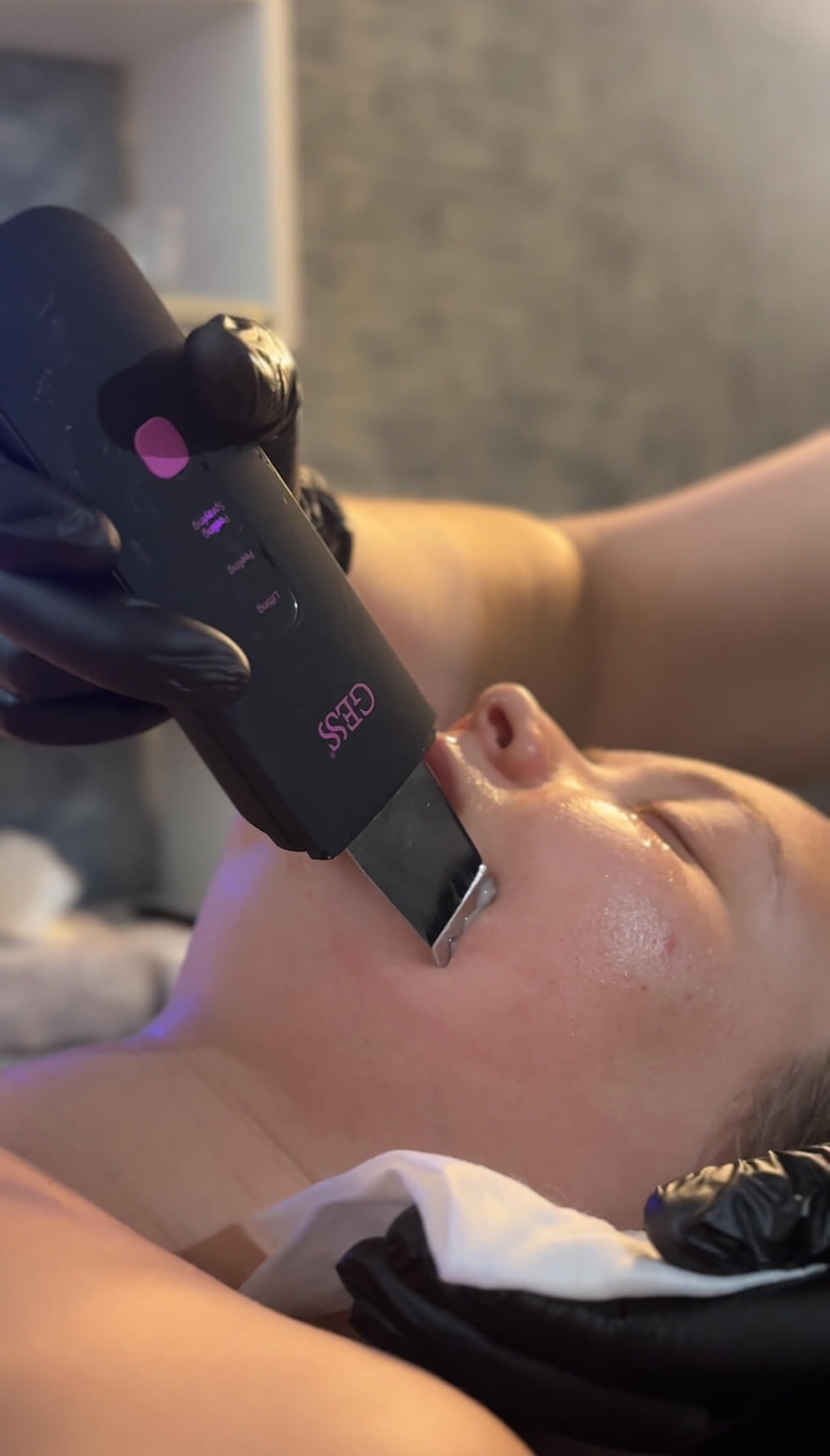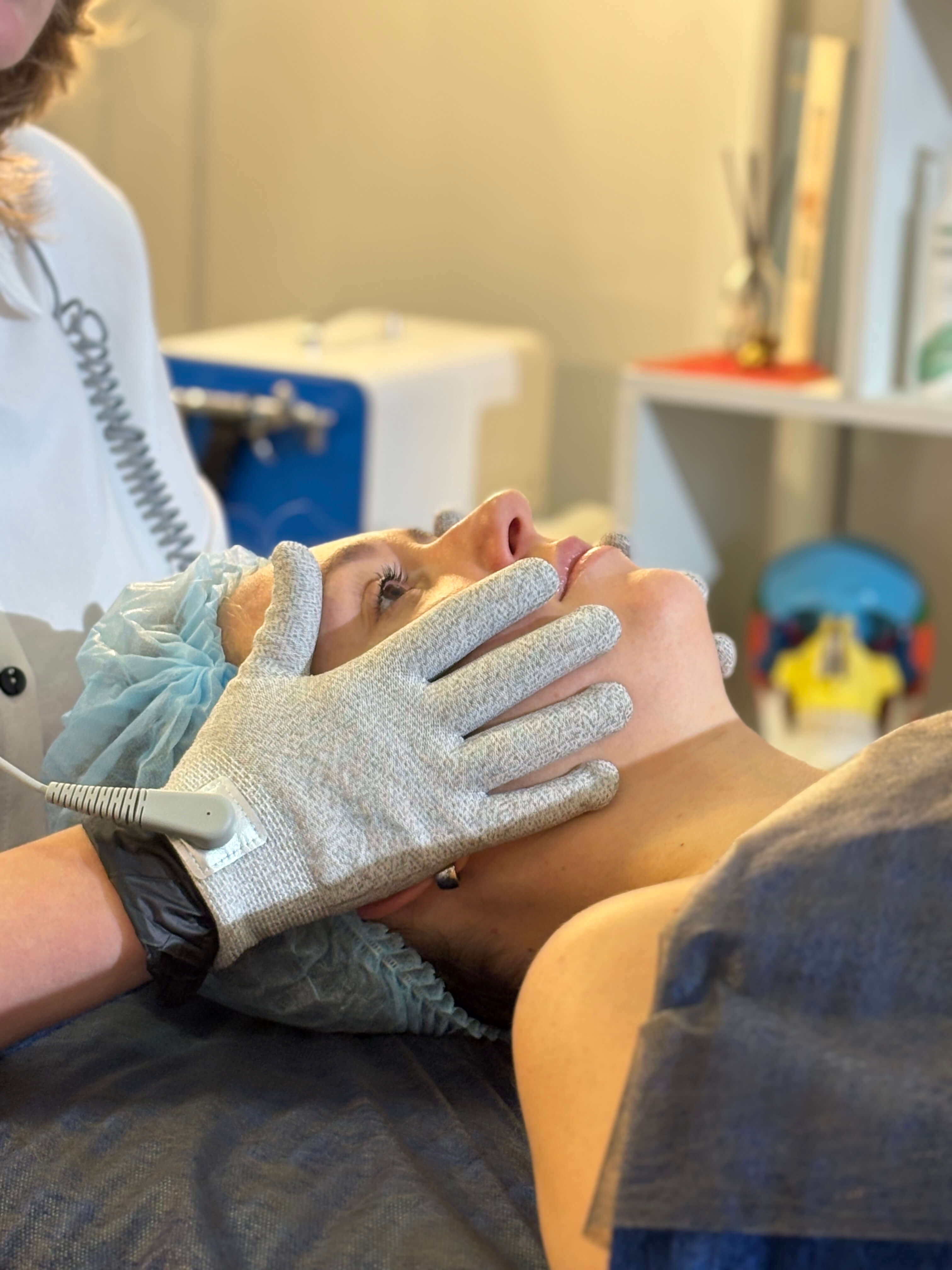 Сеанс состоит из комплекса процедур и включает в себя массаж лица серебряными перчатками и массаж лица ультразвуковой манипулой.